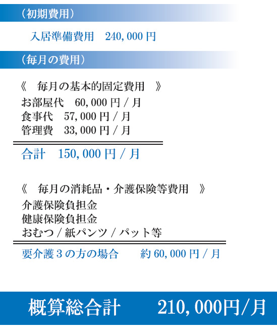 ※ 上記表中消耗品の使用料・介護保険の実費負担額・健康保険利用の実費負担額等につきましては、各利用者様によって異なりますので、あくまで目安となります。